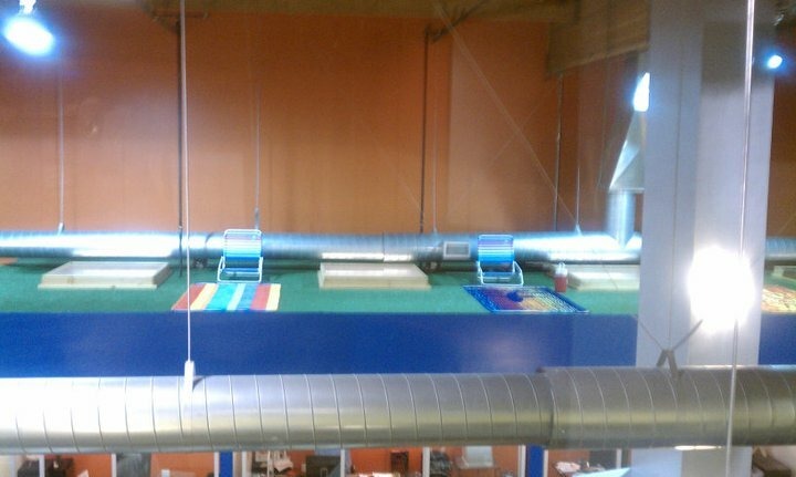 From the upstairs balcony a fake beach scene sits on top of the offices below complete with beach towels, coolers and chairs